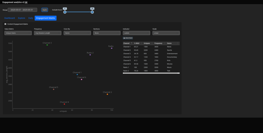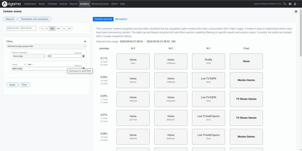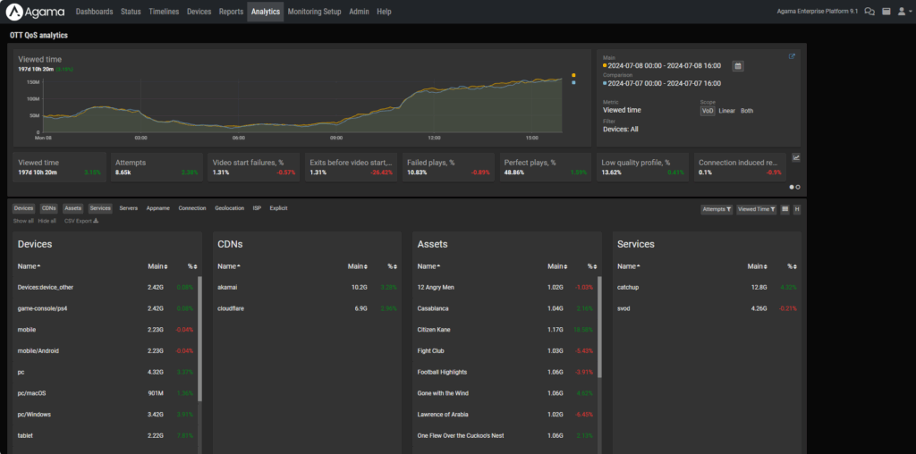 Analyze engagement with behavioral and QoE insights. By correlating viewing behavior (such as sessions, navigation paths, and drop-off points) with QoE metrics (like buffering or errors), teams can see where users disengage and understand how performance impacts engagement. These insights help making informed decisions around retention strategies and churn-related factors.